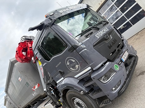 Holzladekran PENZ 16Zp+9.50 und Abrollkipper Hyvalift Titan 22-53SK auf LKW MAN.